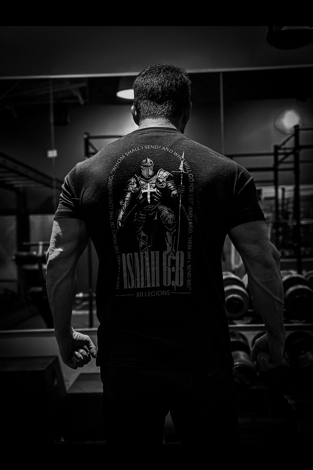 Isaiah 6:8 T-Shirt - Model is 6'2" 215lbs wearing size XL.