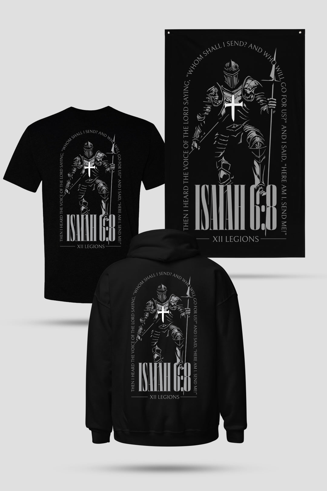 ISAIAH 6:8 – the t-shirt, flag, and hoodie loadout. Flag will arrive separately from apparel.